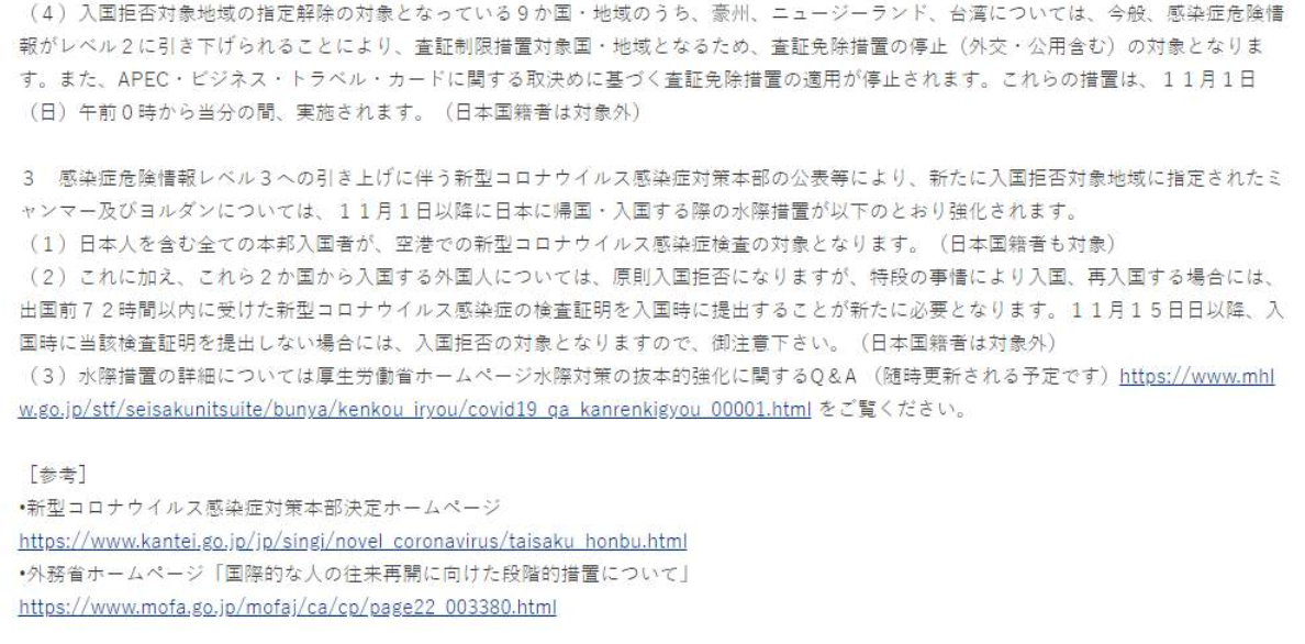 茂木敏充表示,“綜合考慮了放寬移動(dòng)限制及商務(wù)需求等各種因素”。這是疫情暴發(fā)后日本首次下調(diào)傳染病危險(xiǎn)信息級(jí)別。10月30日下午還決定了把這些國(guó)家和地區(qū)排除在原則上拒絕入境的國(guó)家之外。