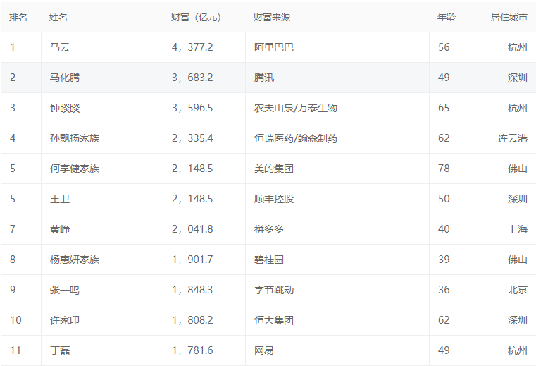 下面是2020年福布斯中國富豪榜前十名榜單: