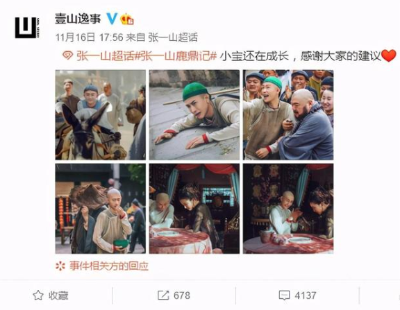 面對(duì)網(wǎng)絡(luò)上張一山飾演的韋小寶的爭(zhēng)議,張一山工作室率先簡(jiǎn)單回應(yīng),表示“小寶還在成長(zhǎng),感謝大家的建議”,顯然工作室認(rèn)為后續(xù)的劇情及演技可以改變觀眾的看法。