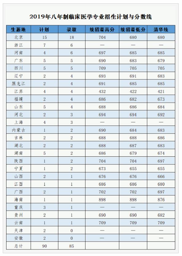 2019年北京協(xié)和醫(yī)學(xué)院八年制臨床醫(yī)學(xué)專業(yè)高考招生計(jì)劃90名,根據(jù)教育部的政策取消了二次招生。實(shí)際高招錄取85名,其中有全省排名前10的考生5名、全國生物和化學(xué)競賽金牌保送生5名。